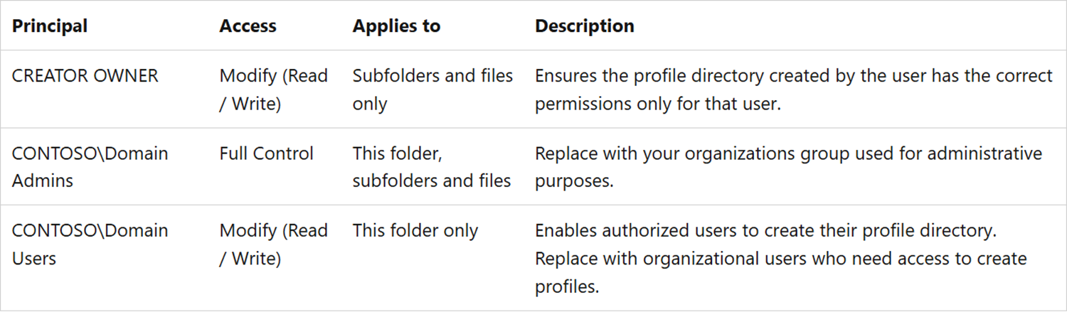Windows ACL(s) are important to configure correctly so that only the user (CREATOR OWNER) has access to their profile directory or VHD(x) file. Additionally, you need to ensure any other administrative groups have 'Full Control' from an operational perspective. This concept is known as user-based access and is the recommended configuration.