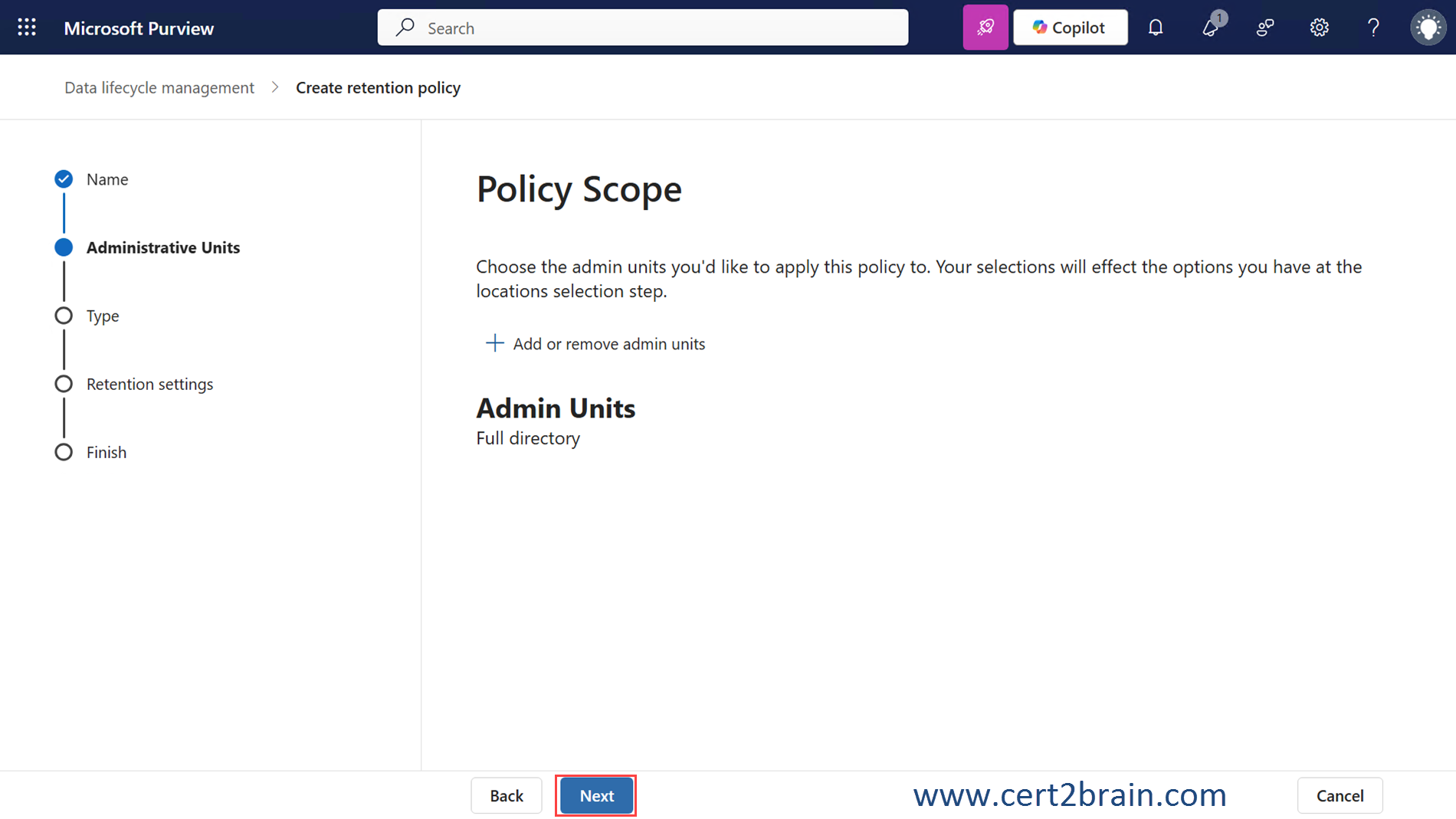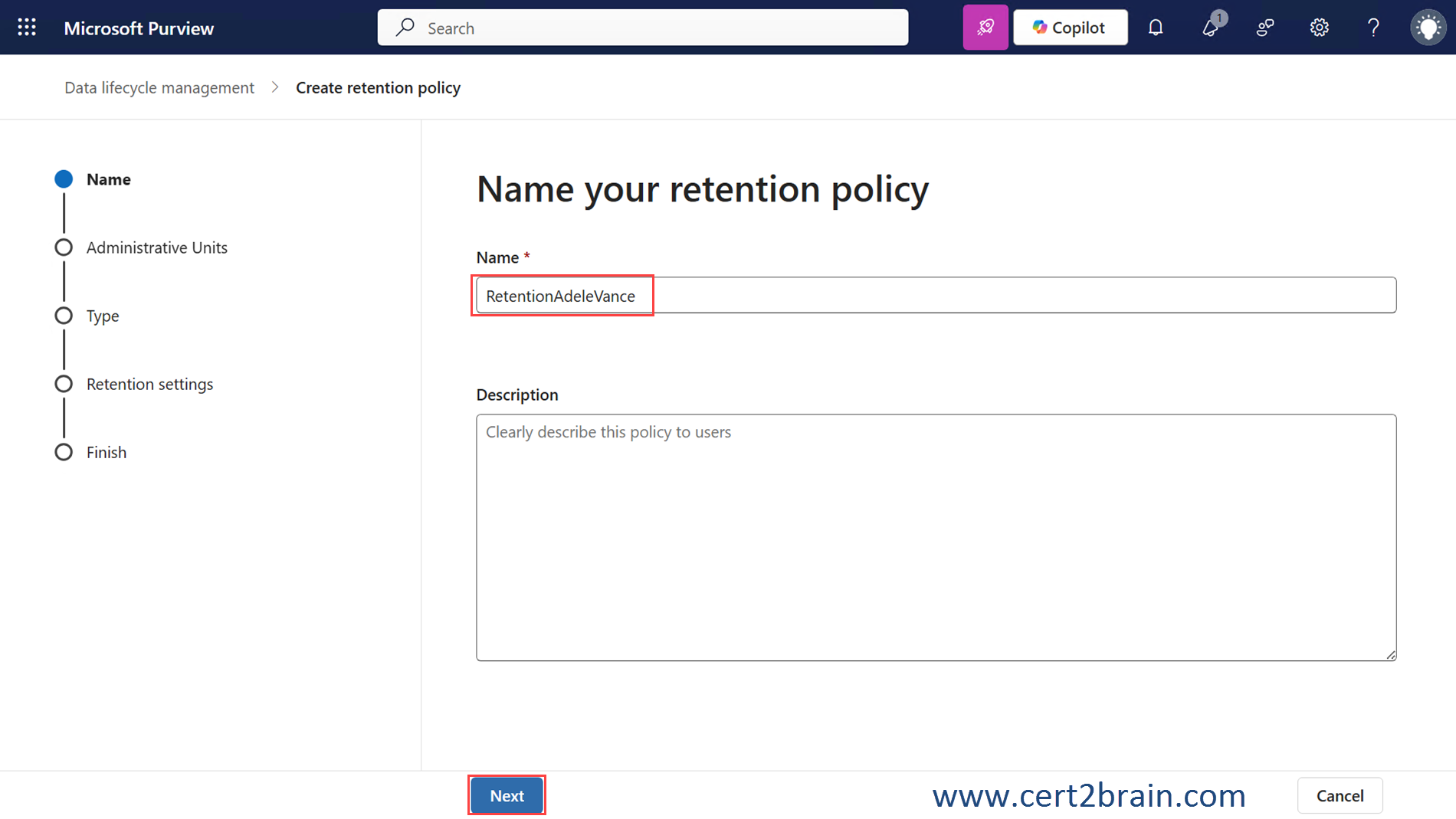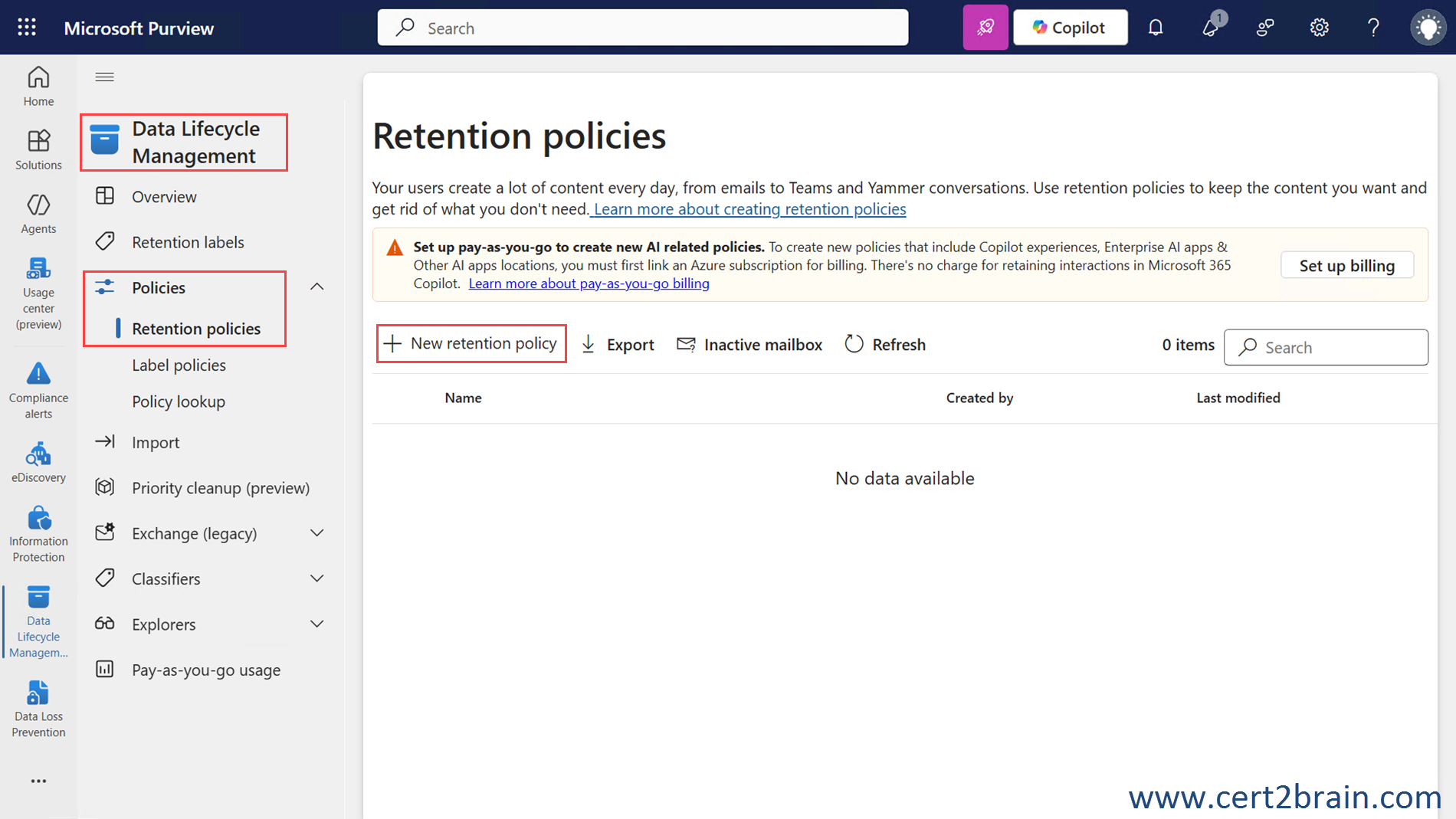 Step 01: Sign in to the Microsoft Purview portal (https://purview.microsoft.com). Select the Data Lifecycle Management solution and browse to Policies > Retention policies. Click on + New retention policy.