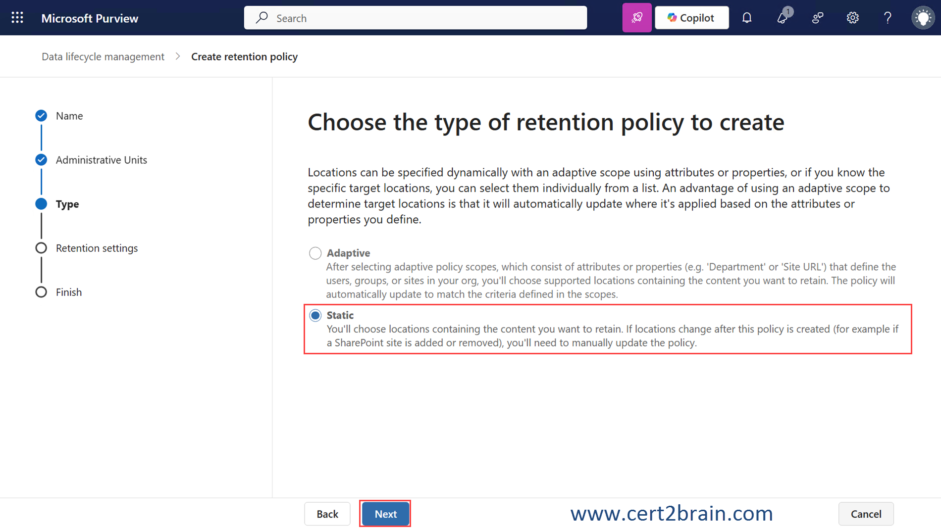 Step 04: Select Static as the type of retention policy to create. Then click Next.