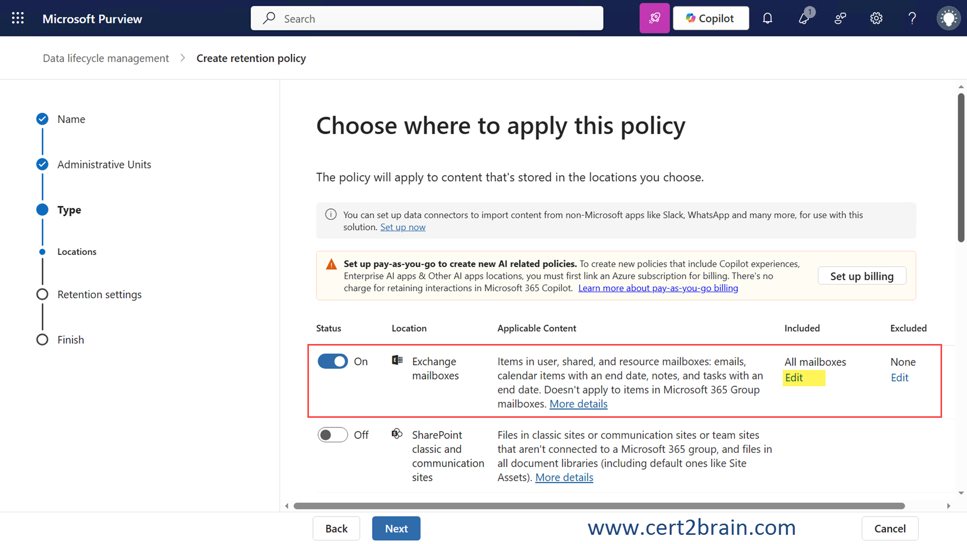 Step 05: Ensure that only the Exchange mailboxes location is selected. Then click the Edit link as shown below.