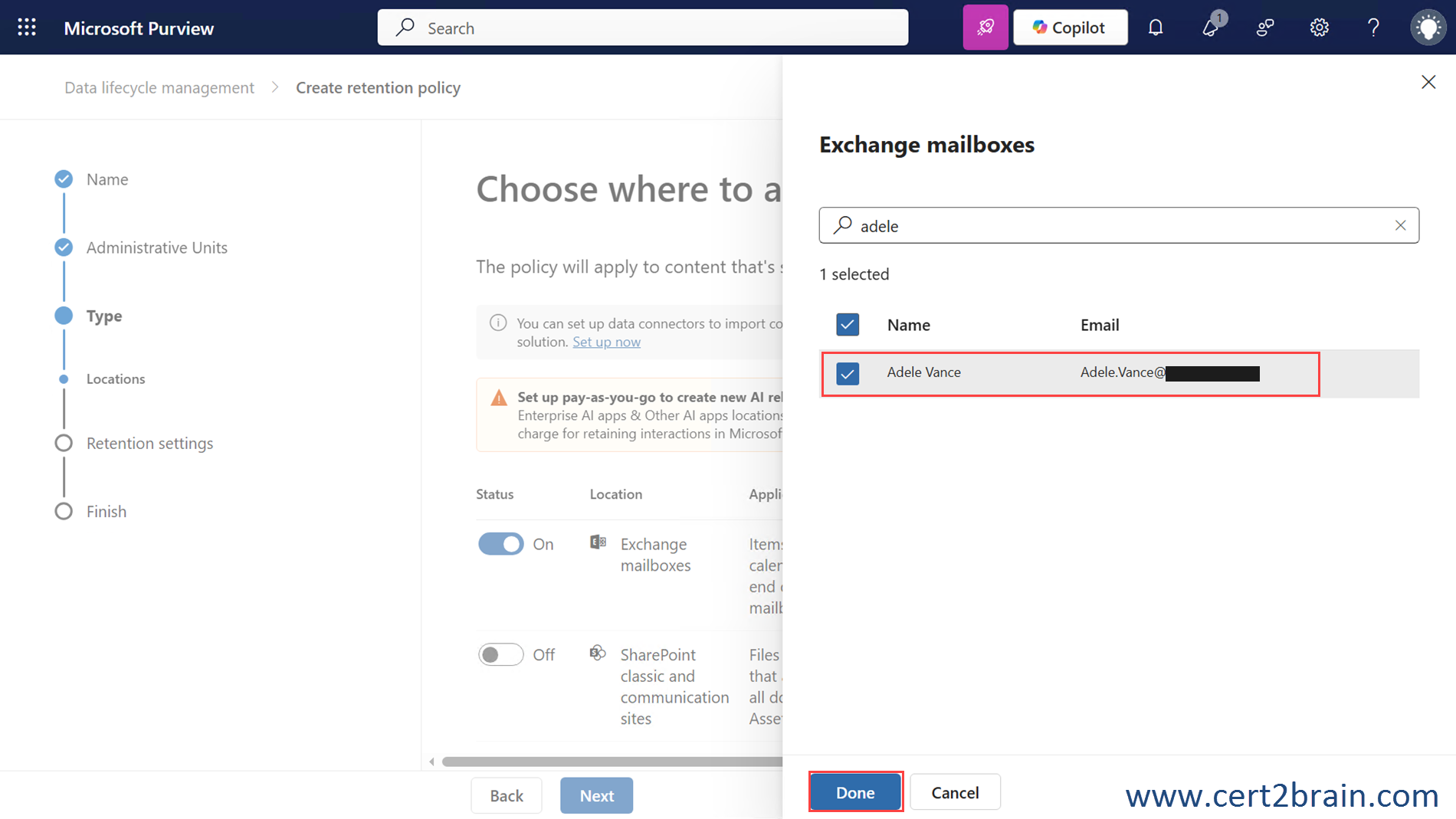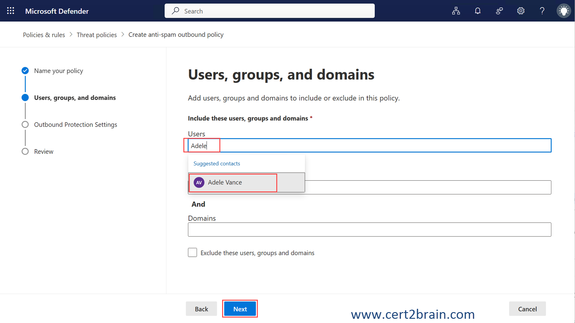 Step 06: Make sure, only Adele Vance is included in the policy.