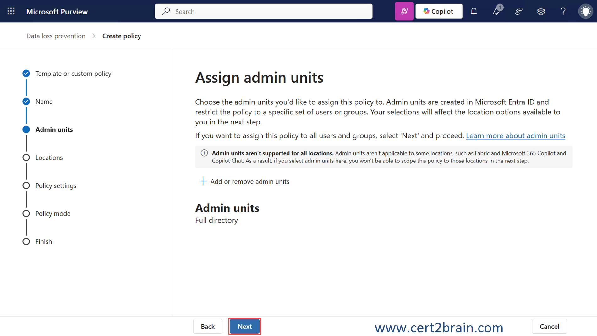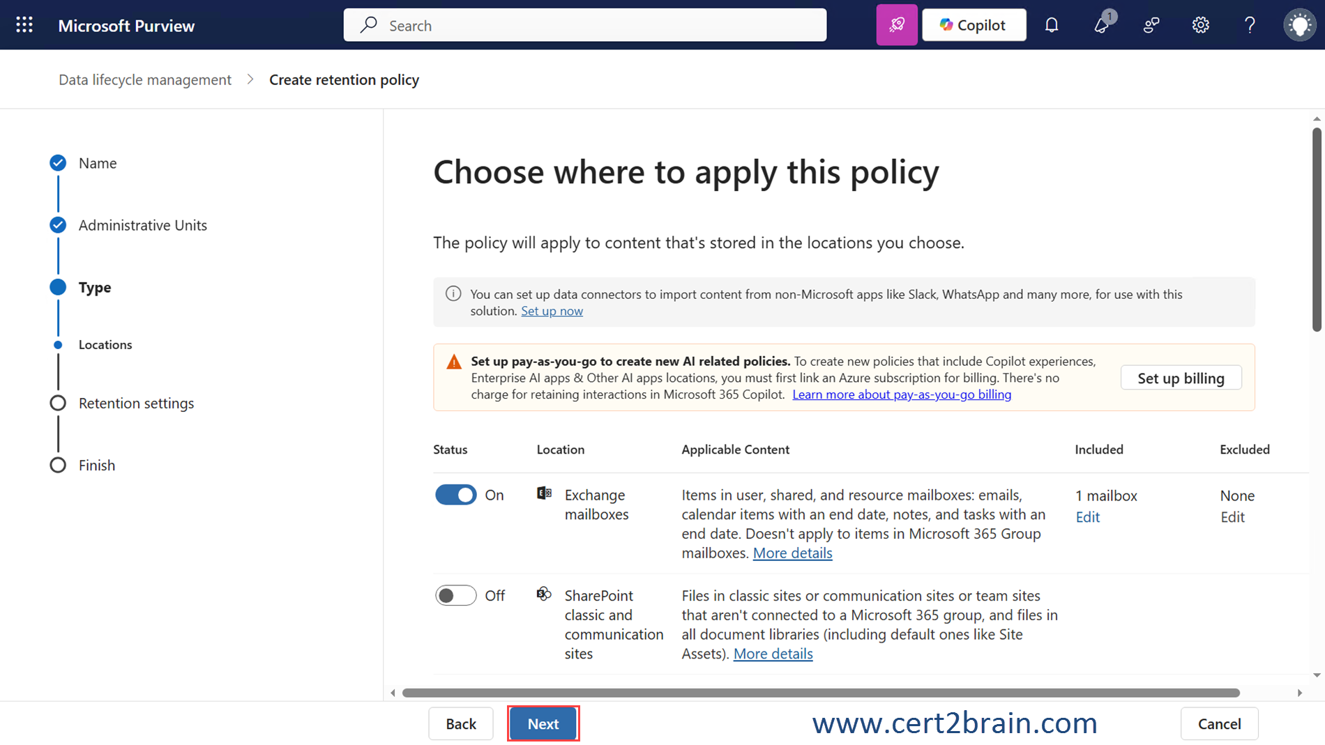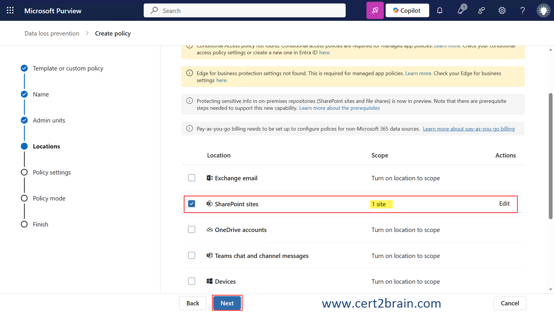 Step 06: Configure the Locations to include only the Contoso Landings Microsoft SharePoint Online site. Then click Next.