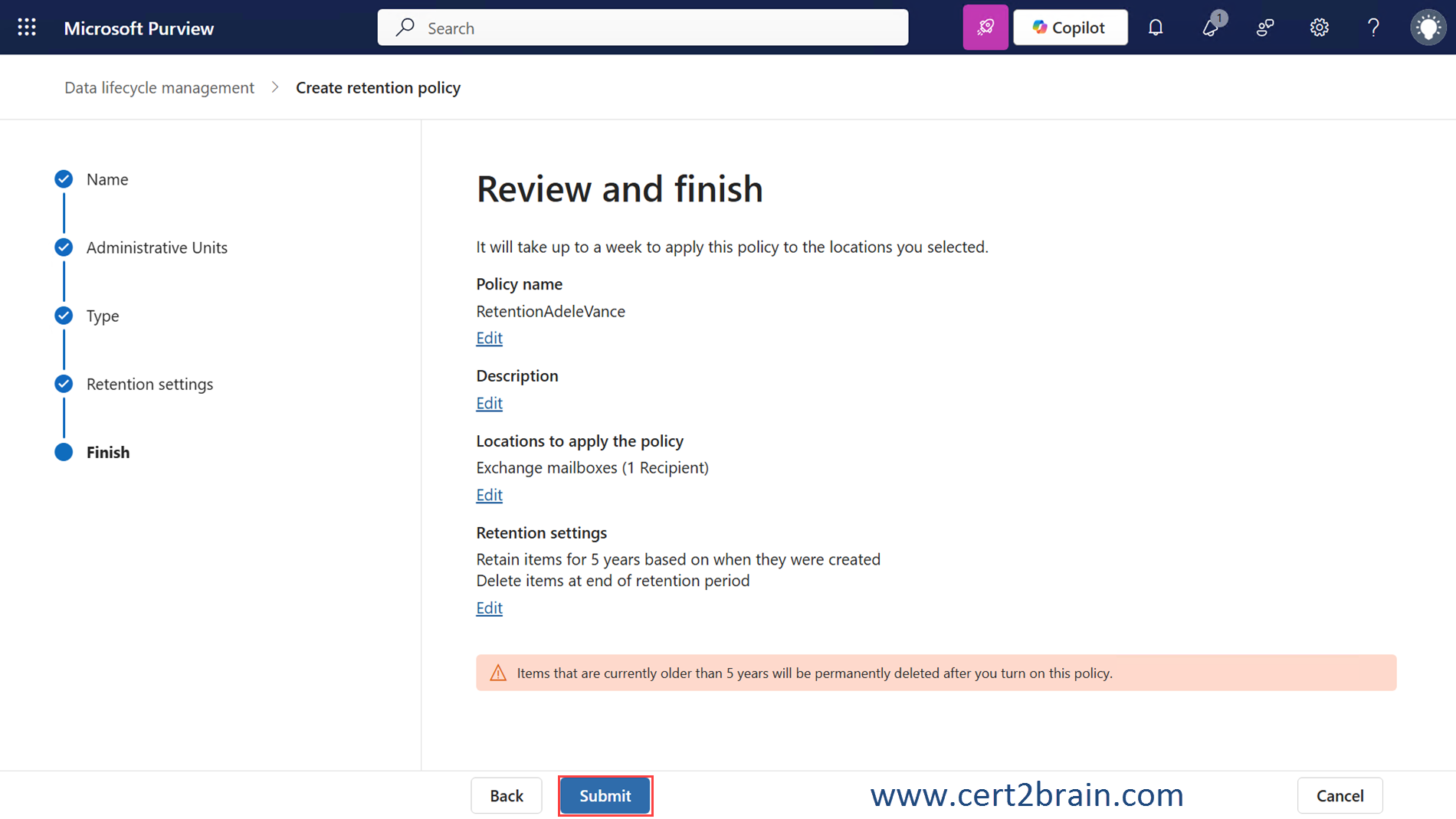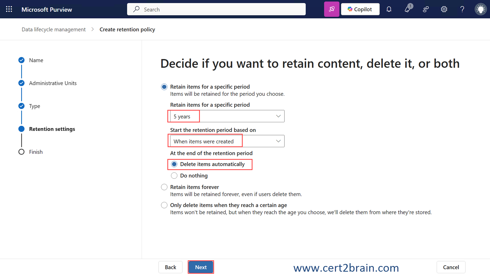 Step 08: Configure the policy to retain items for 5 years and to delete them at the end of the retention period. Then click Next.
