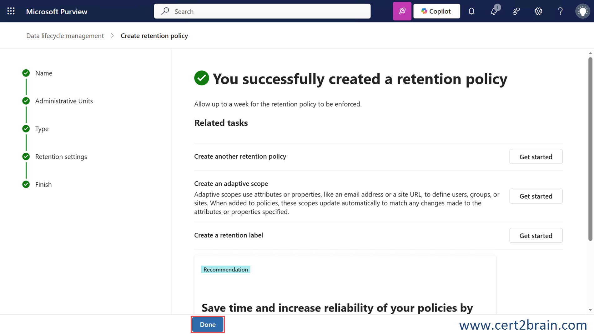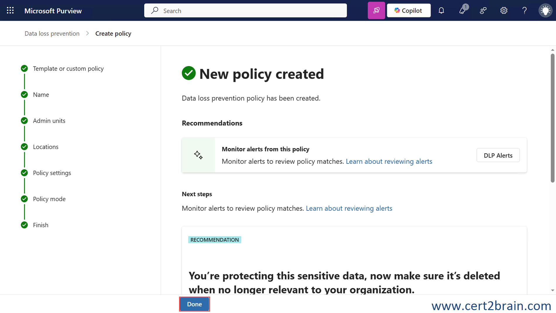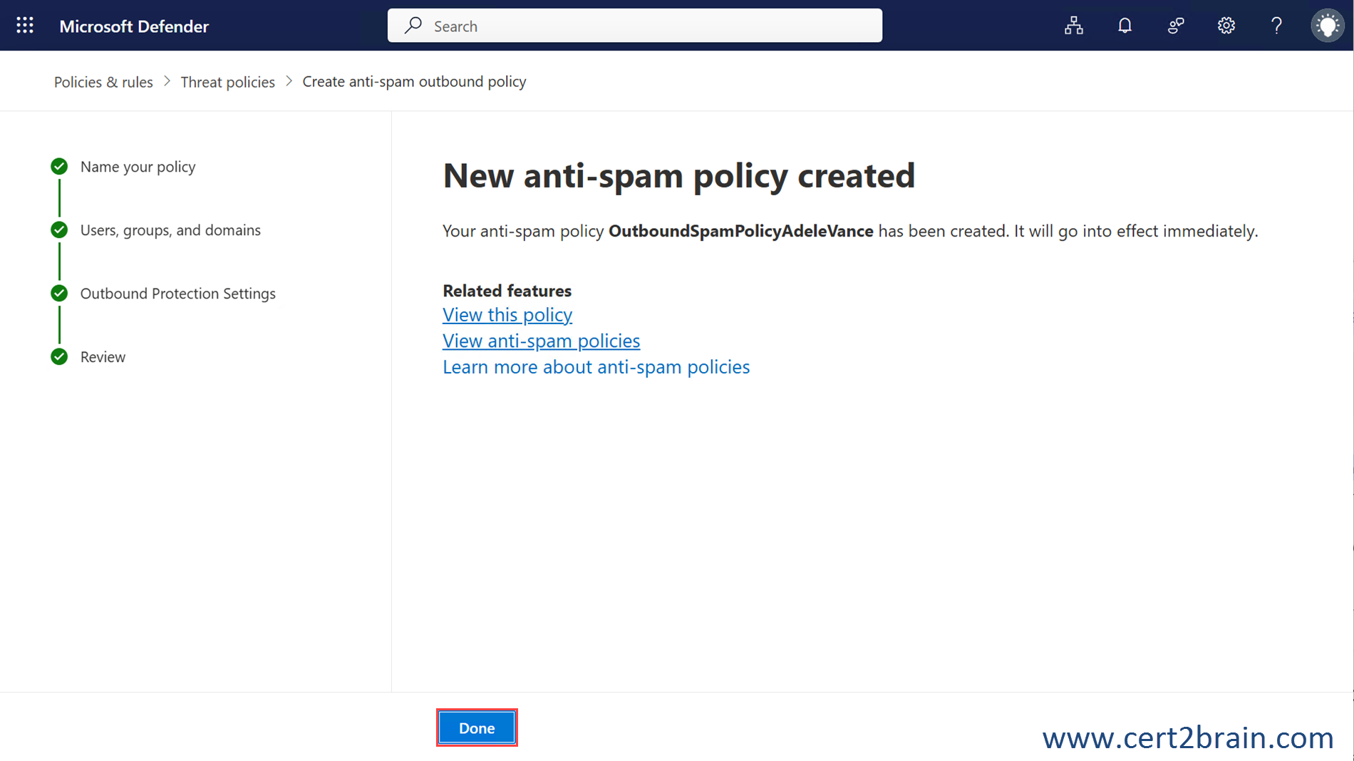 Step 06: The policy has been created successfully. Click Done. The task is completed.