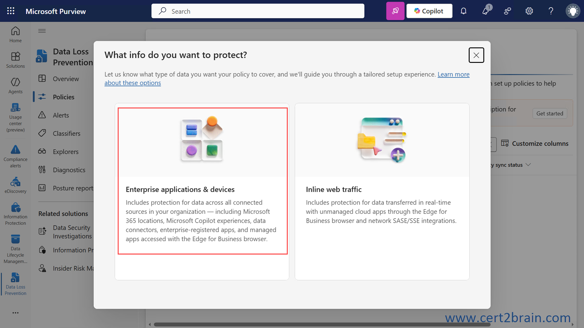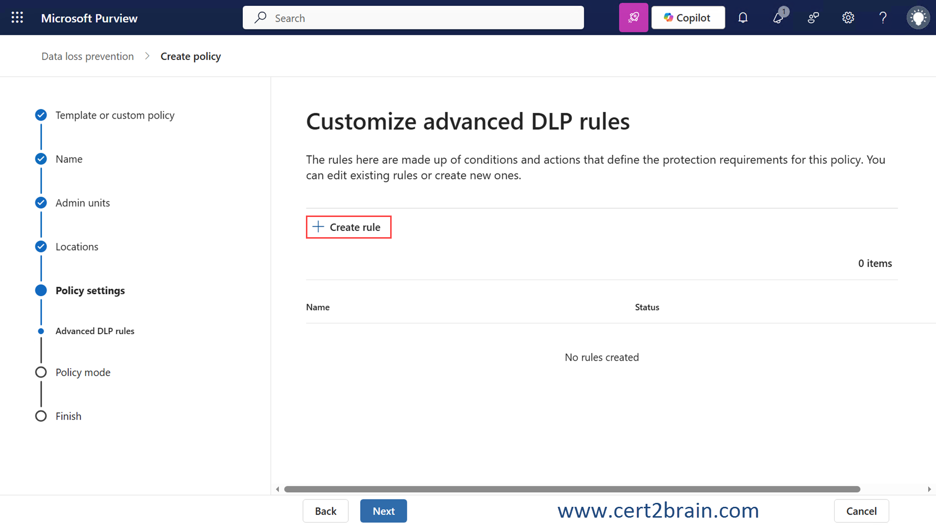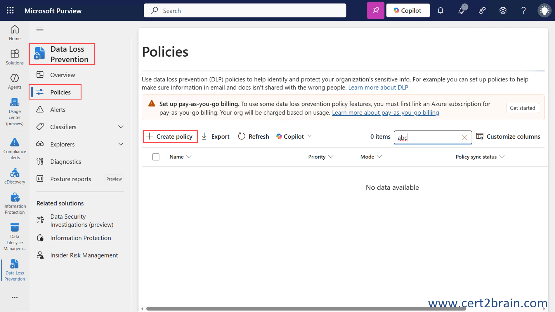 Step 01: Sign in to the Microsoft Purview portal (https://purview.microsoft.com). Select the Data Loss Prevention solution and browse to Policies. Click on + Create policy.