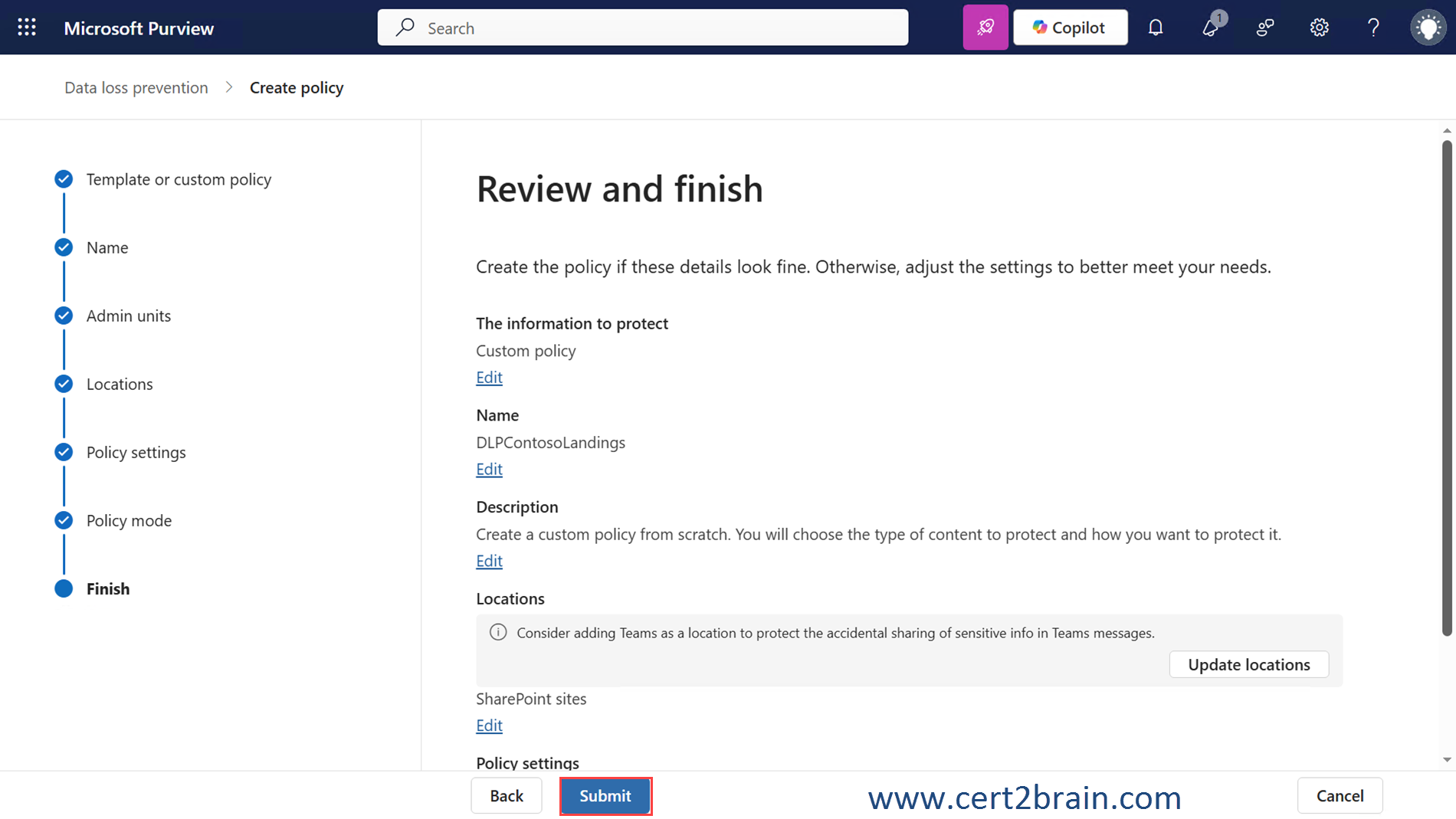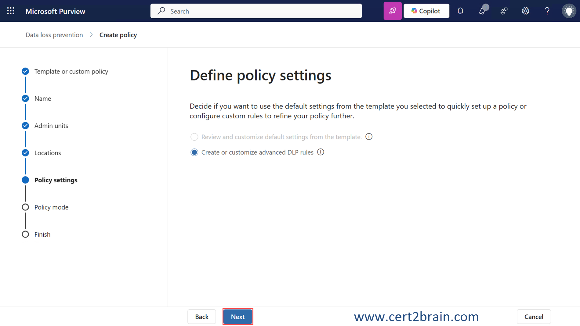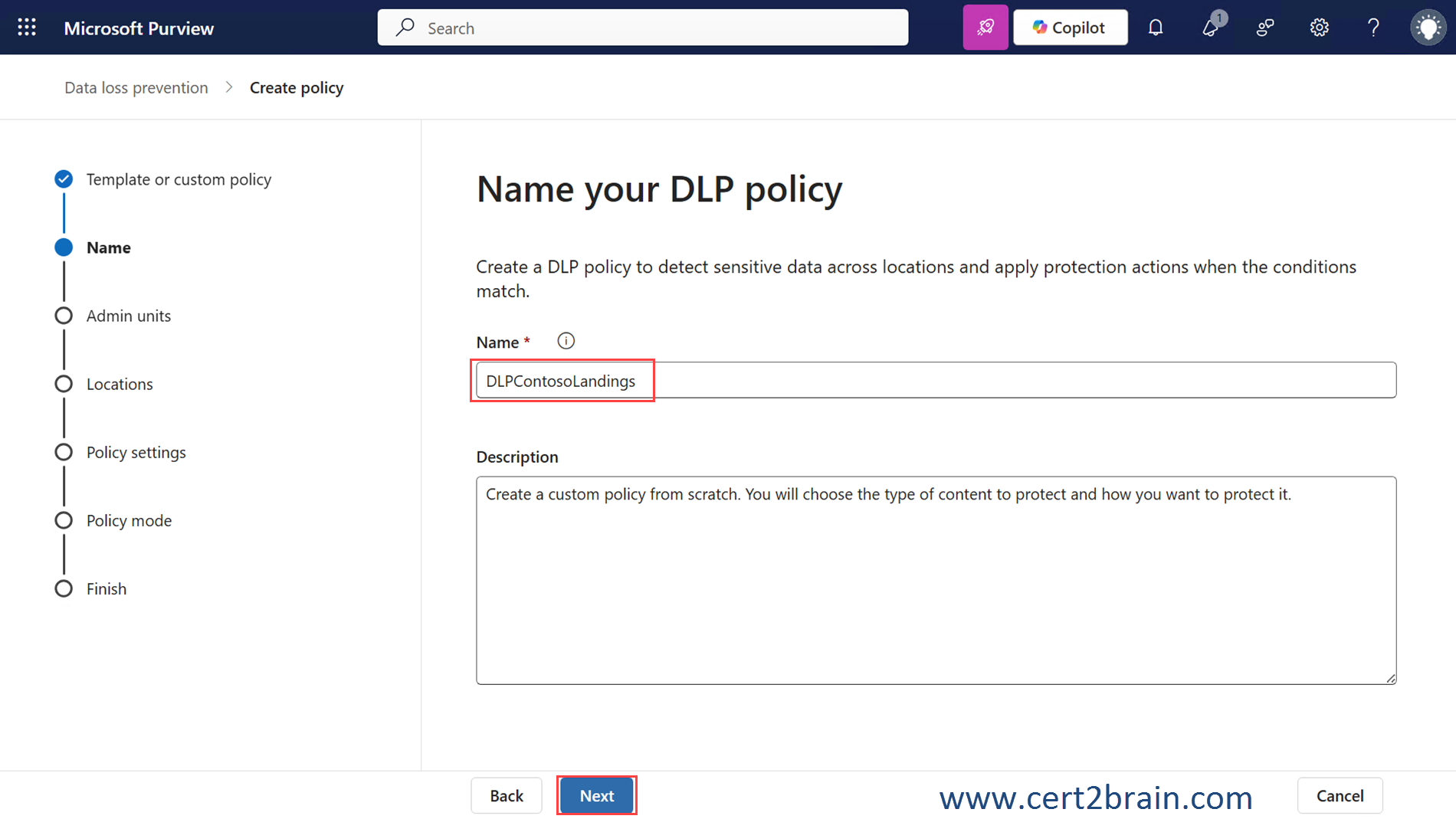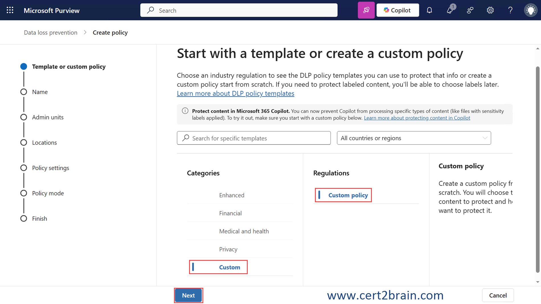 Step 01: Sign in to the Microsoft Purview portal (https://purview.microsoft.com). Select the Data Loss Prevention solution and browse to Policies. Click on + Create policy.