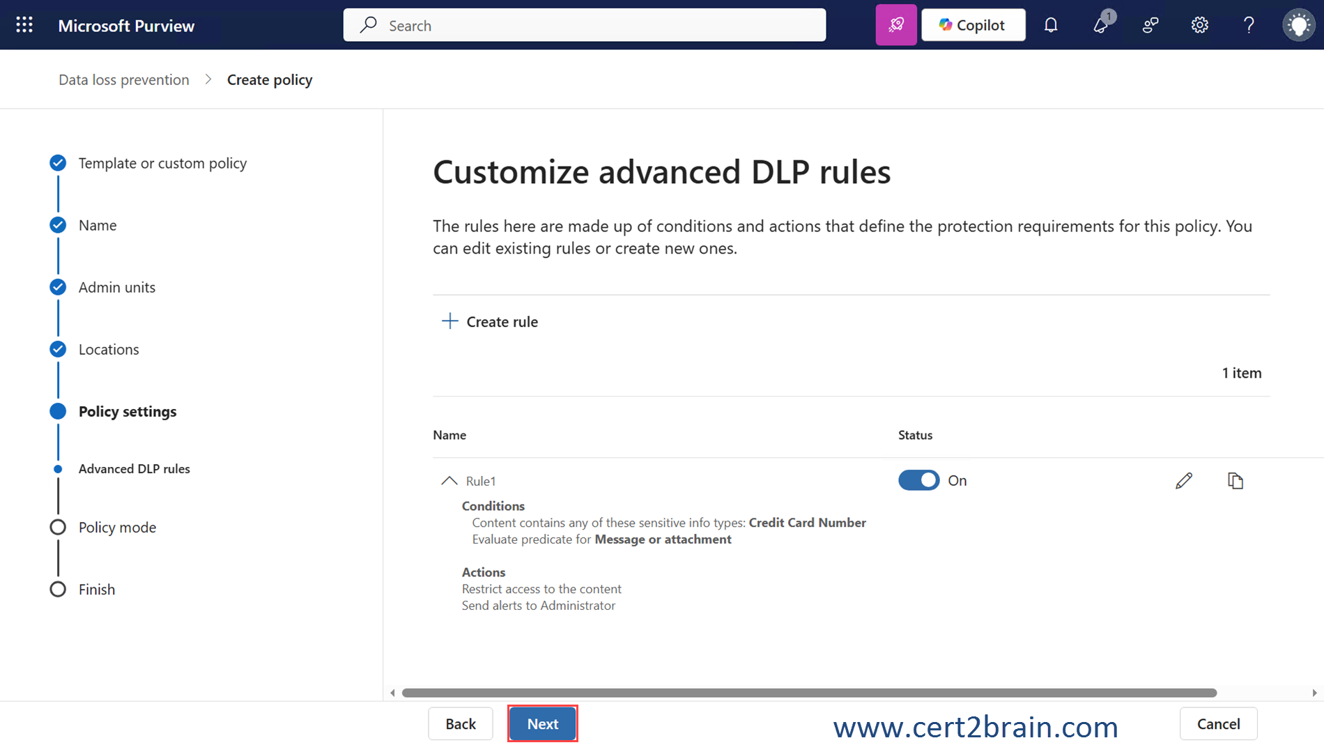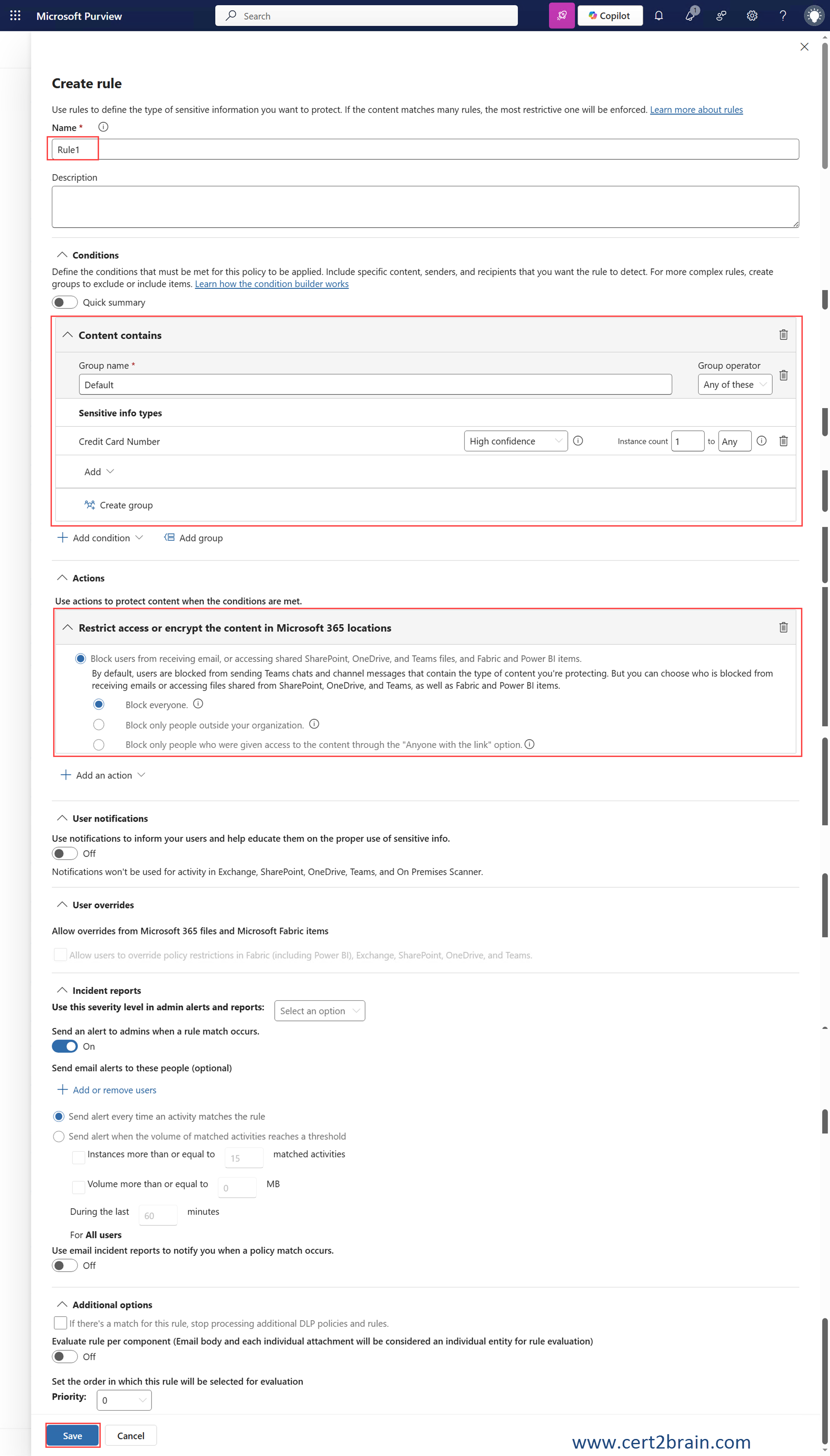 Step 09: Enter a name for the new rule. Configure the Content contains condition to match Credit Card Numbers. Configure the Actions to block everyone (For files in SharePoint, OneDrive, and teams, only the owner, last modifier, and site admin will have access). Then click Save.