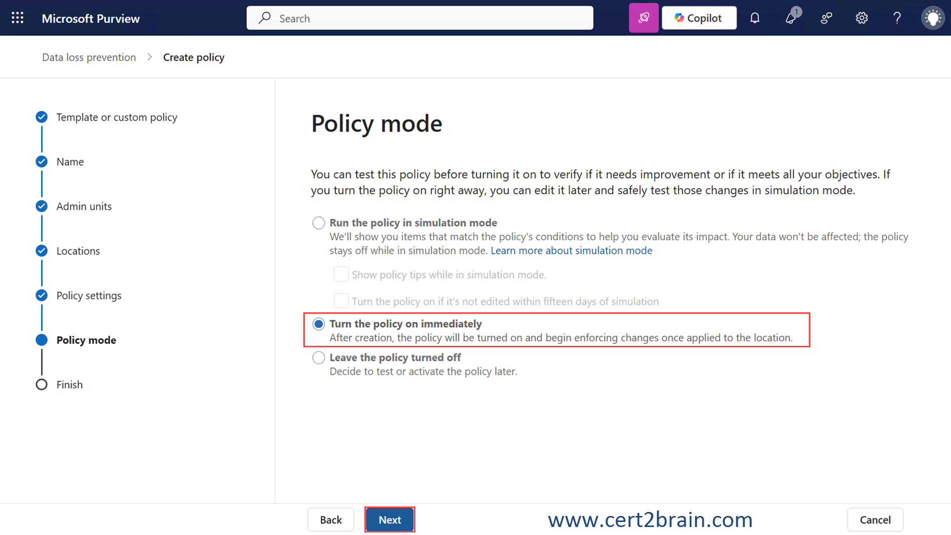 Step 11: Select Turn the policy on immediately. Then click Next.