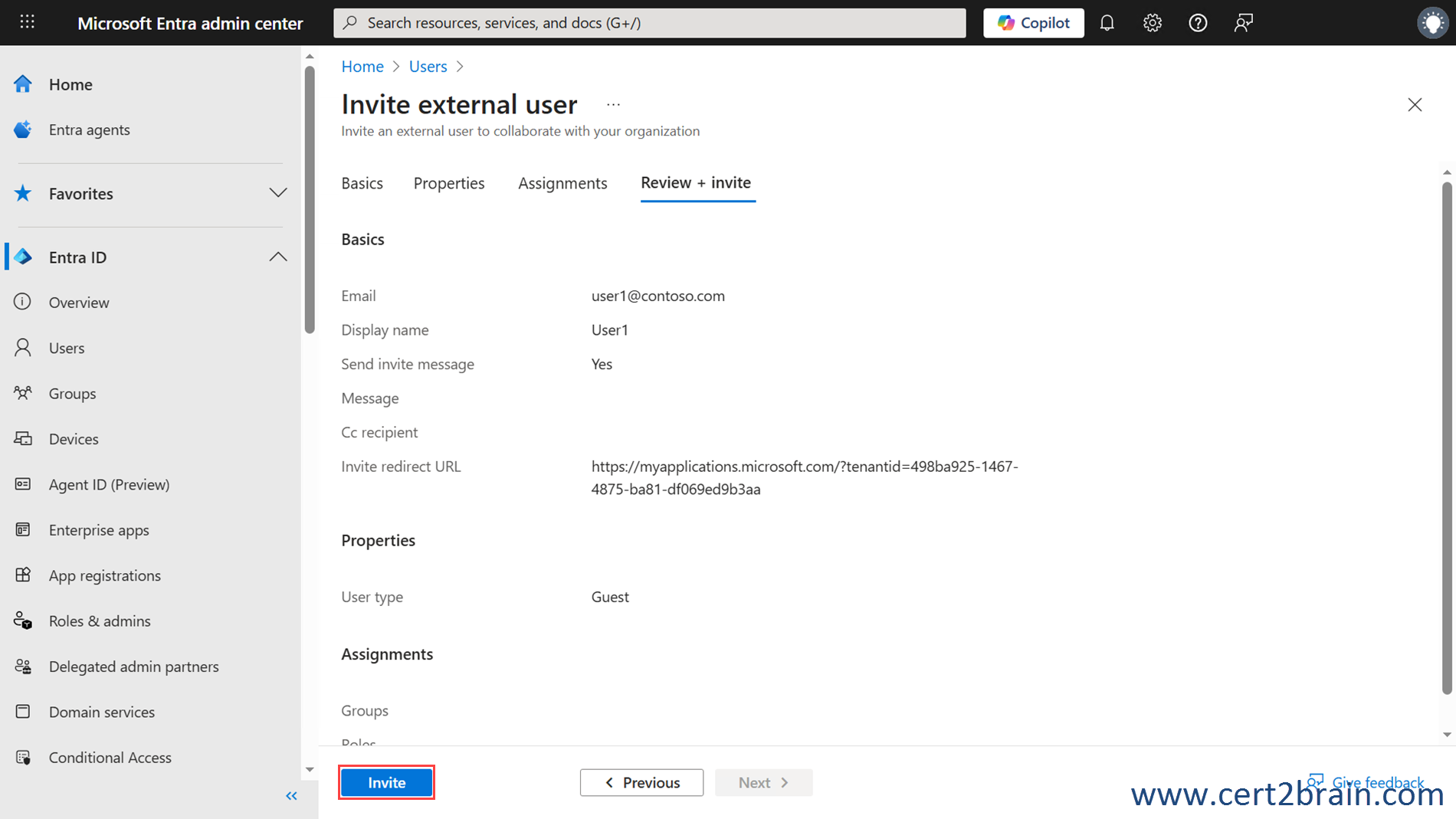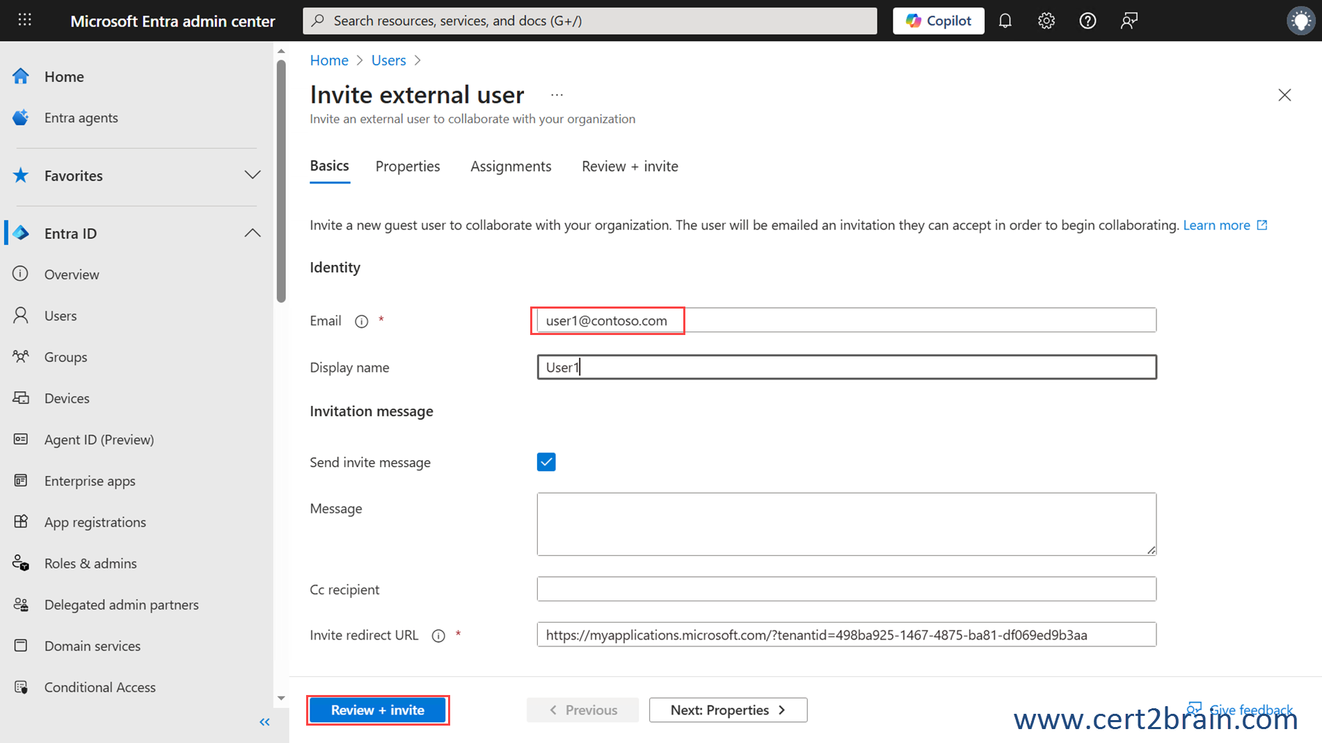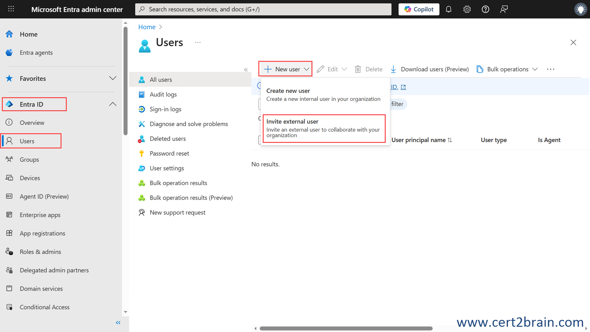 Step 01: Sign in to the Microsoft Entra admin center (https://entra.microsoft.com). Browse to Entra ID > Users. Expand + New user and click on Invite external user.