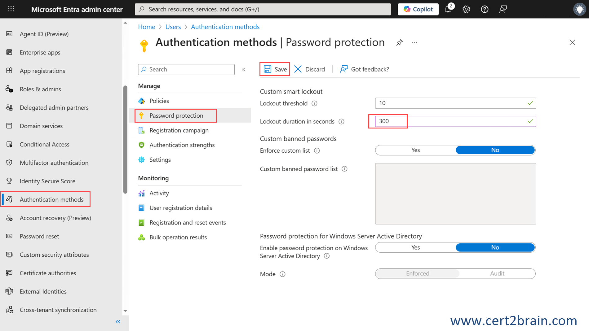 Step 01: Sign in to the Microsoft Entra admin center (https://entra.microsoft.com). Browse to Entra ID > Authentication methods and select Password protection. Change the Lockout duration in seconds setting from 60 seconds to 300 seconds. Then click Save. The task is completed.