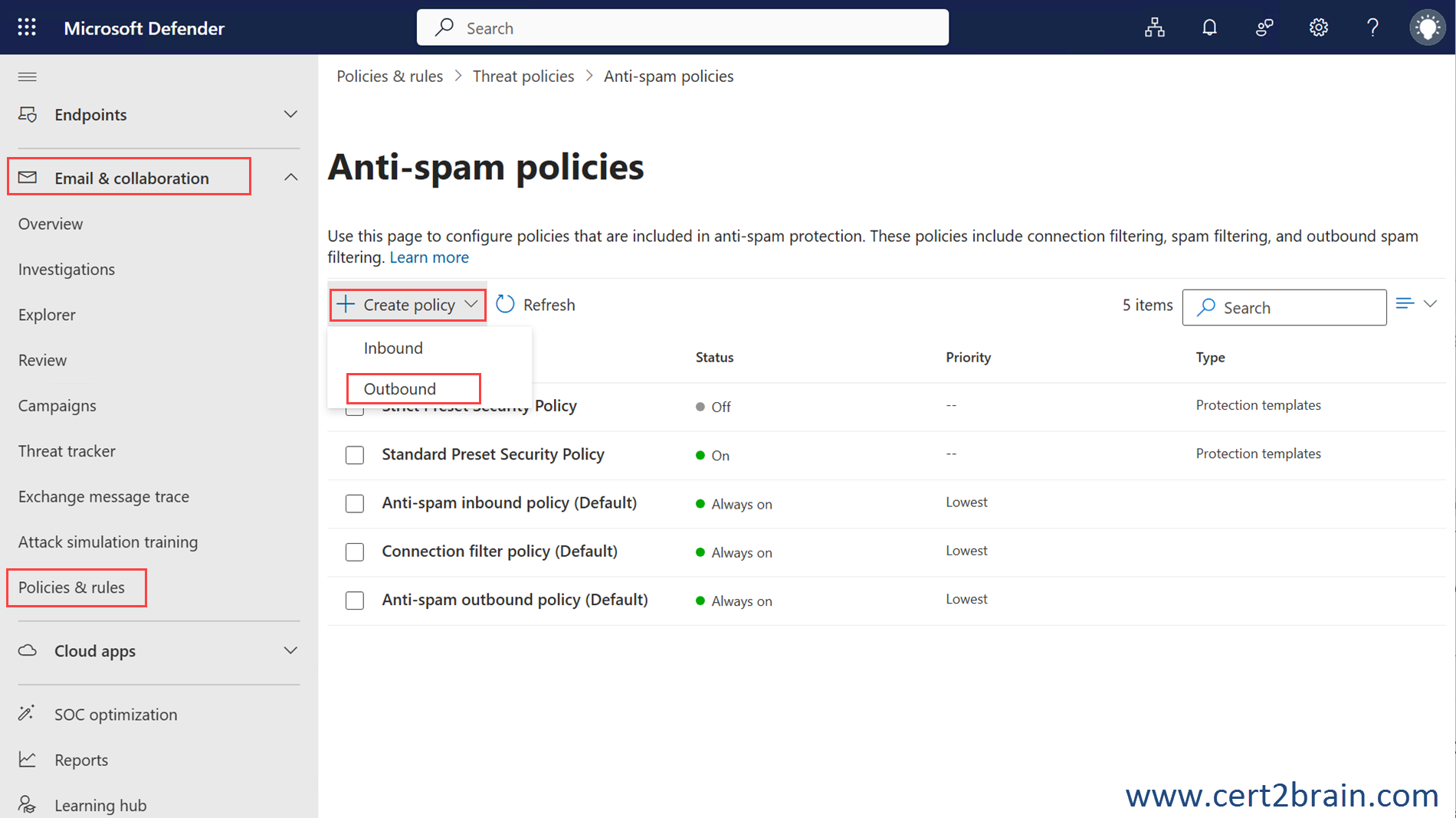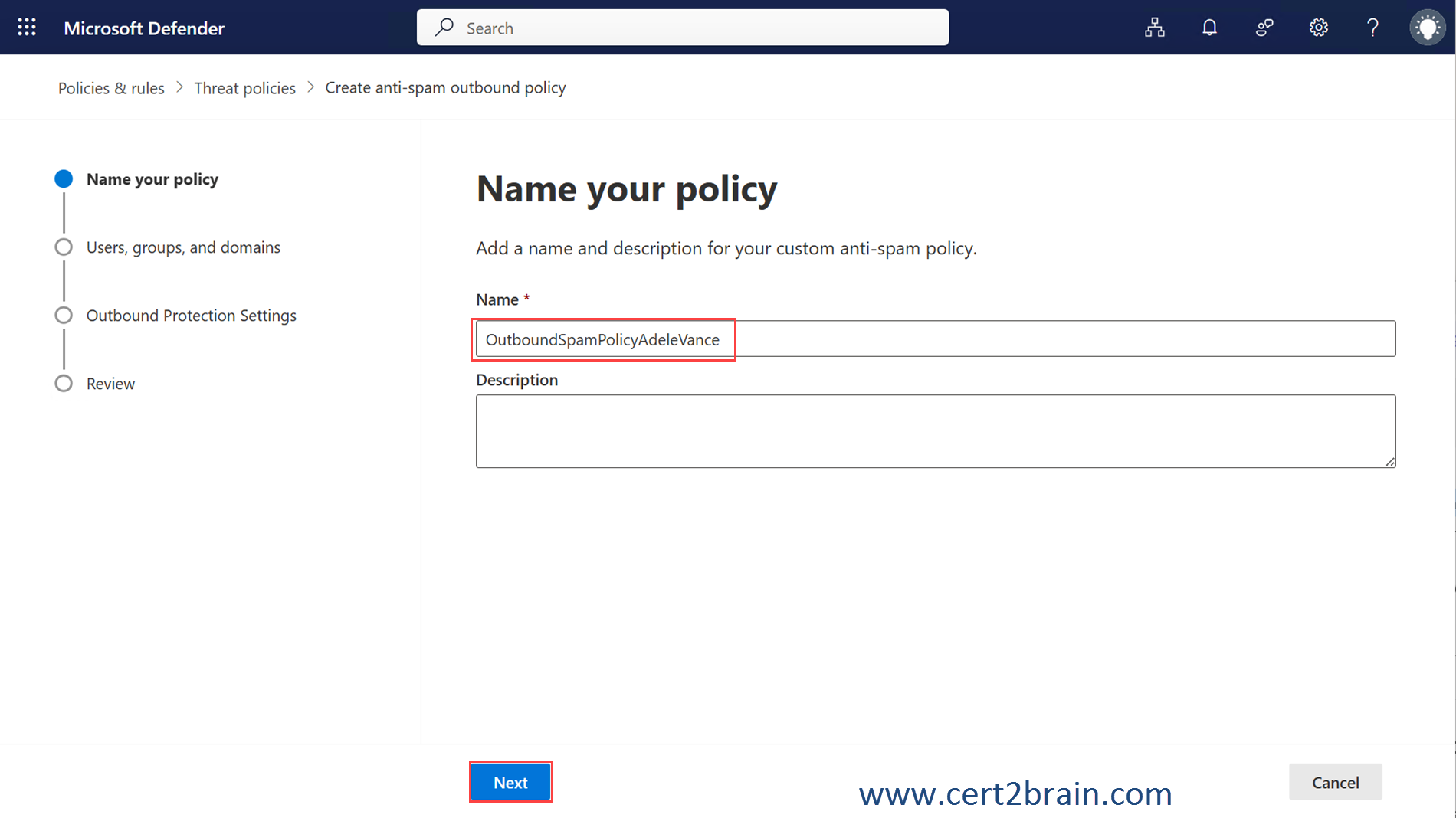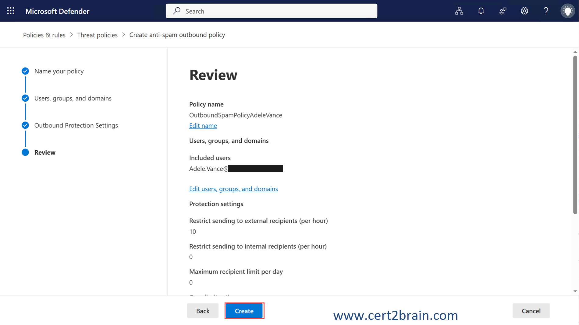 Step 01: Sign in to the Microsoft Defender portal (https://security.microsoft.com). Browse to Email & collaboration > Policies & rules. Click Threat policies. Then click Anti-spam. Expand + Create policy and click Outbound.