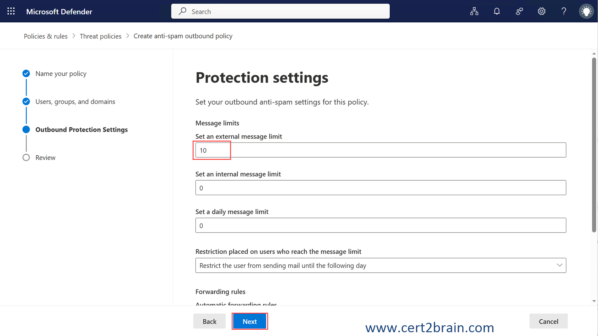 Step 04: Set "Set an external message limit" to 10. The setting specifies the maximum number of external recipients per hour. Then click Next.