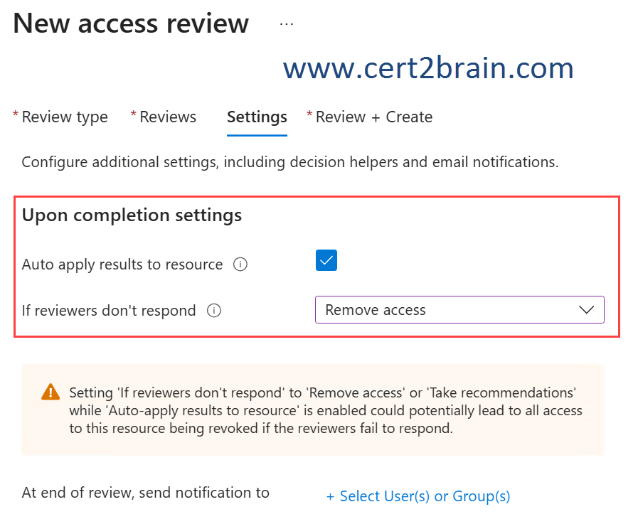 To ensure that if the group owners fail to review the membership of Review1, guest users are removed automatically, we need to configure the Upon completion settings as shown below.