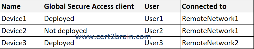 You have a Microsoft Entra tenant that contains two remote networks named RemoteNetwork1 and RemoteNetwork2 and the users shown in the following table.