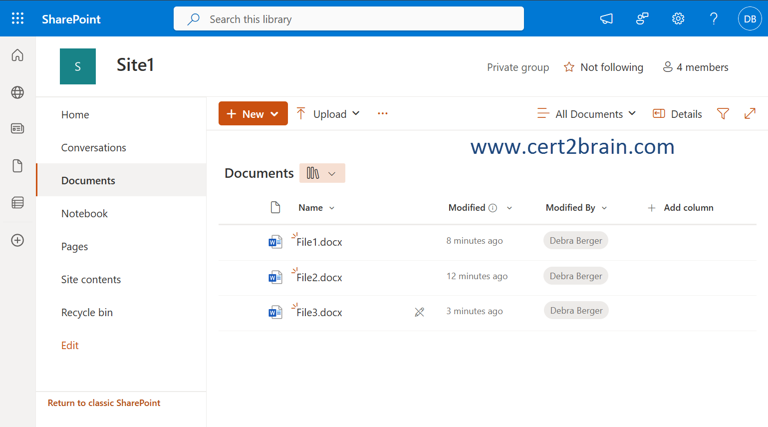 A user named User1 deletes a file named File1.docx from a Microsoft SharePoint Online site named Site1.