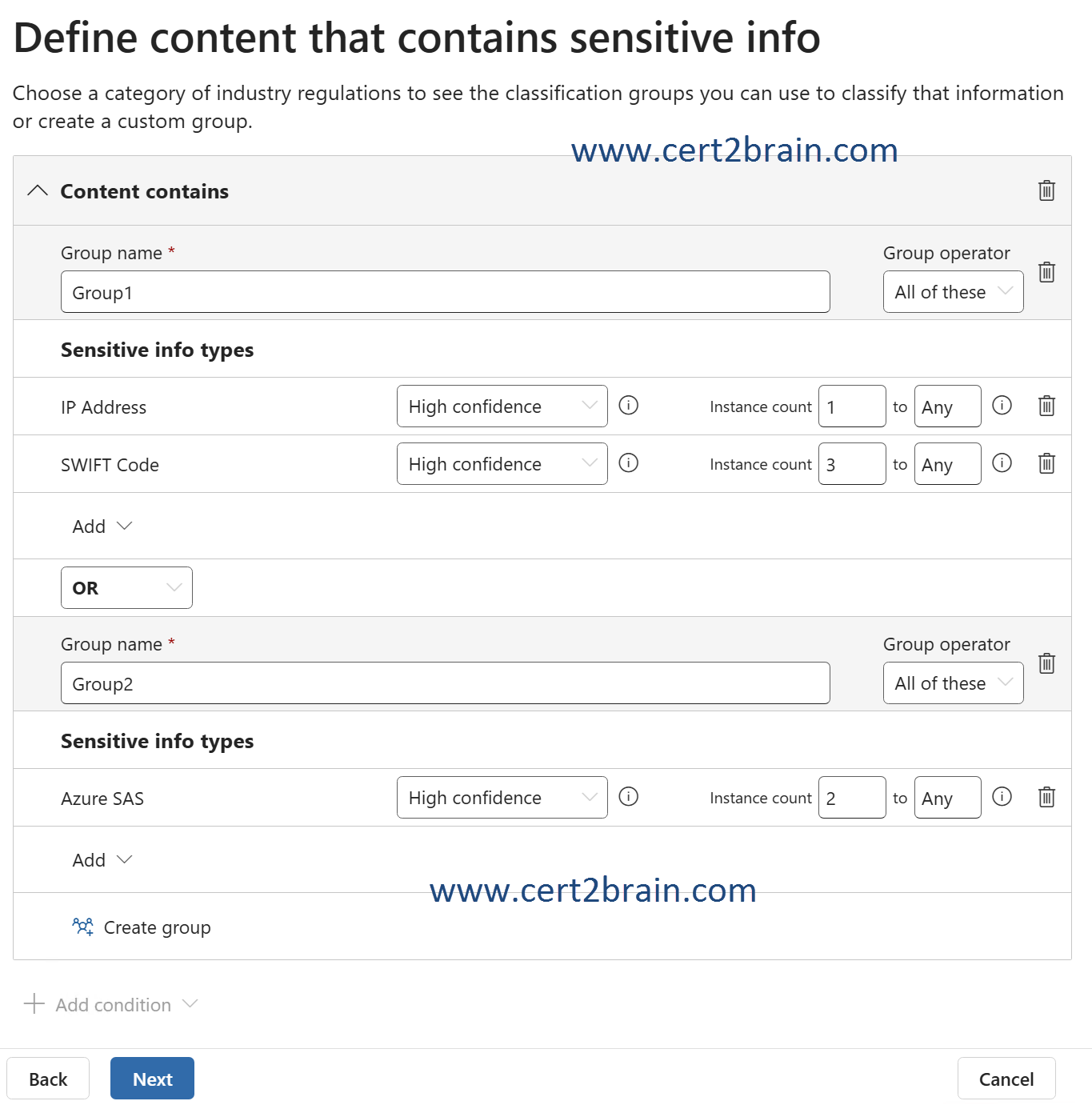 Content must either match all conditions of Group1 OR all conditions of Group2 to have the retention policy applied.